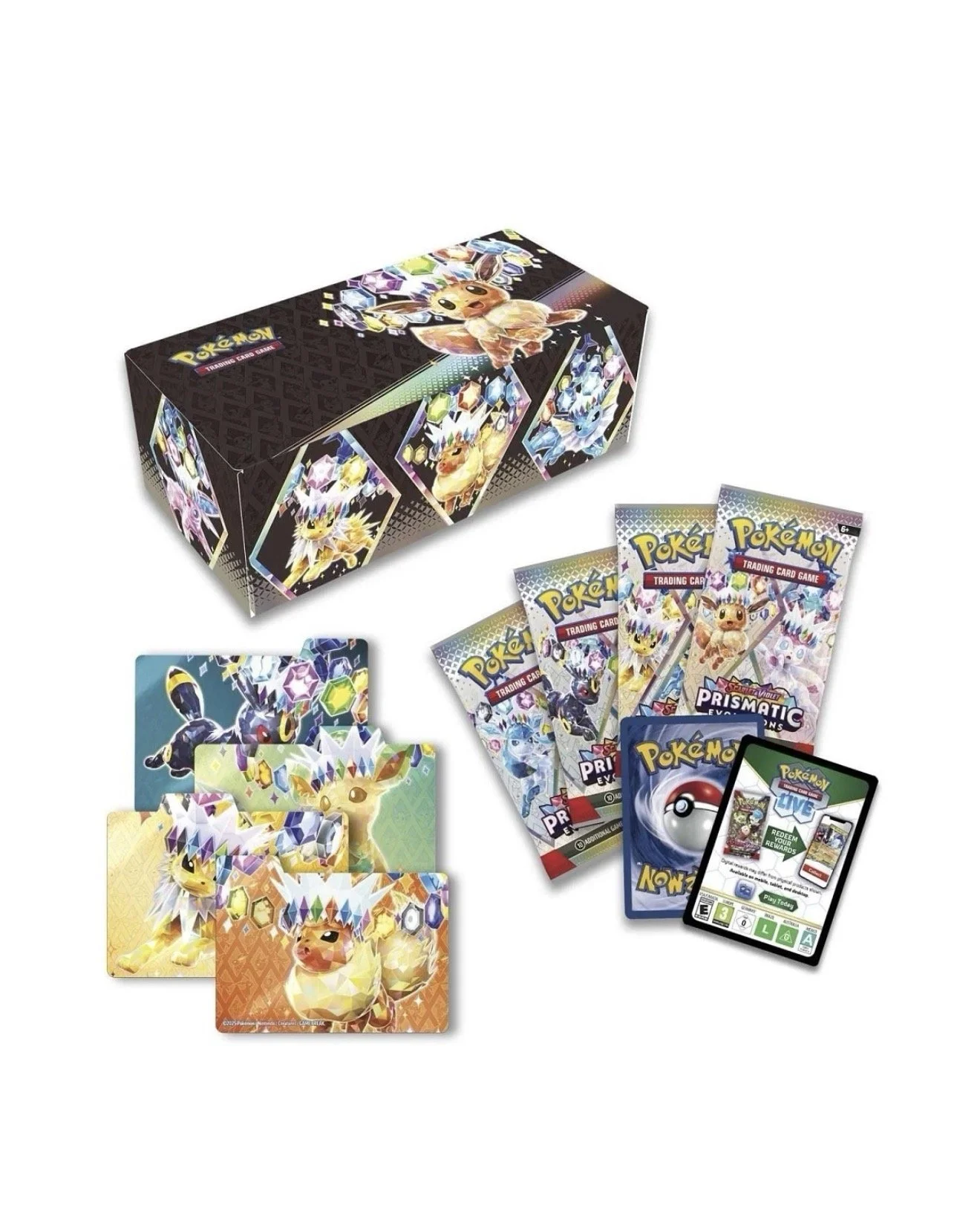 Eevee and its Evolutions all have unique strengths to discover—and they get even more powerful when they appear as Pokémon ex! In this collection, you get one randomly selected foil promo card featuring Eevee or one of its Evolutions as a Stellar Tera Pokémon ex, plus four booster packs from the special Scarlet & Violet—Prismatic Evolutions expansion. Then use the included dividers to organize and store your new cards inside this box!
